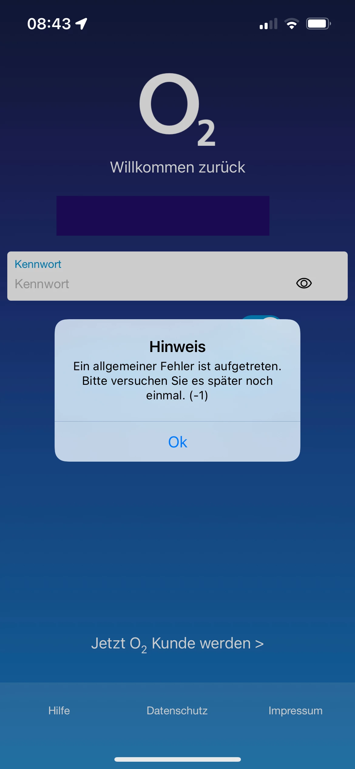 Beim dem Einloggen auf meinem iPhone 13 Pro (iOS 15.5) ist um 08:43 die folgende Fehlermeldung erschienen „Ein allgemeiner Fehler ist aufgetreten. Bitte versuchen Sie es später noch einmal . (-1).“; siehe Screenshot