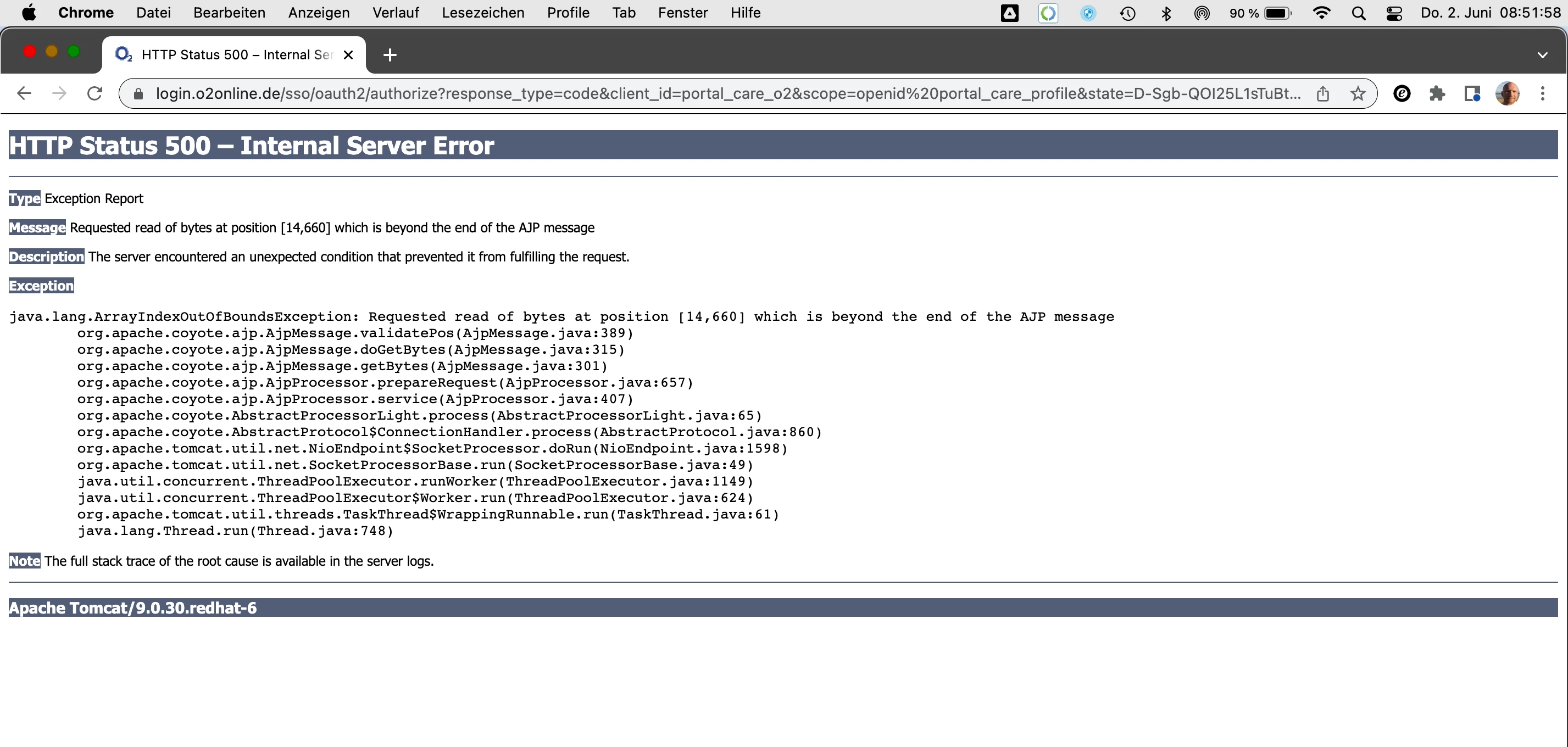 Der Login unter https://www.o2online.de/mein-o2/ ist derzeit nicht möglich. Es erscheint die Fehlermeldung “HTTP Status 500 – Internal Server Error”; siehe Screenshot.