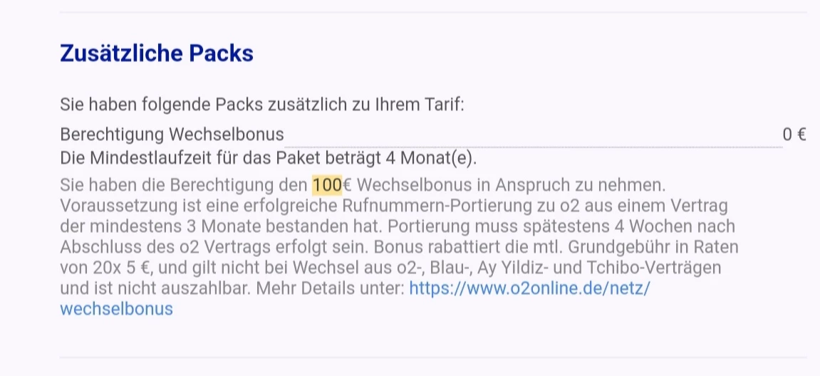Ich habe den Vertrag mit Media Markt über das Internet abgeschlossen. Unter den Optionen habe ich mich für die 100 Euro Nummernportierungsprämie entschieden. Das steht in meinem Vertrag.