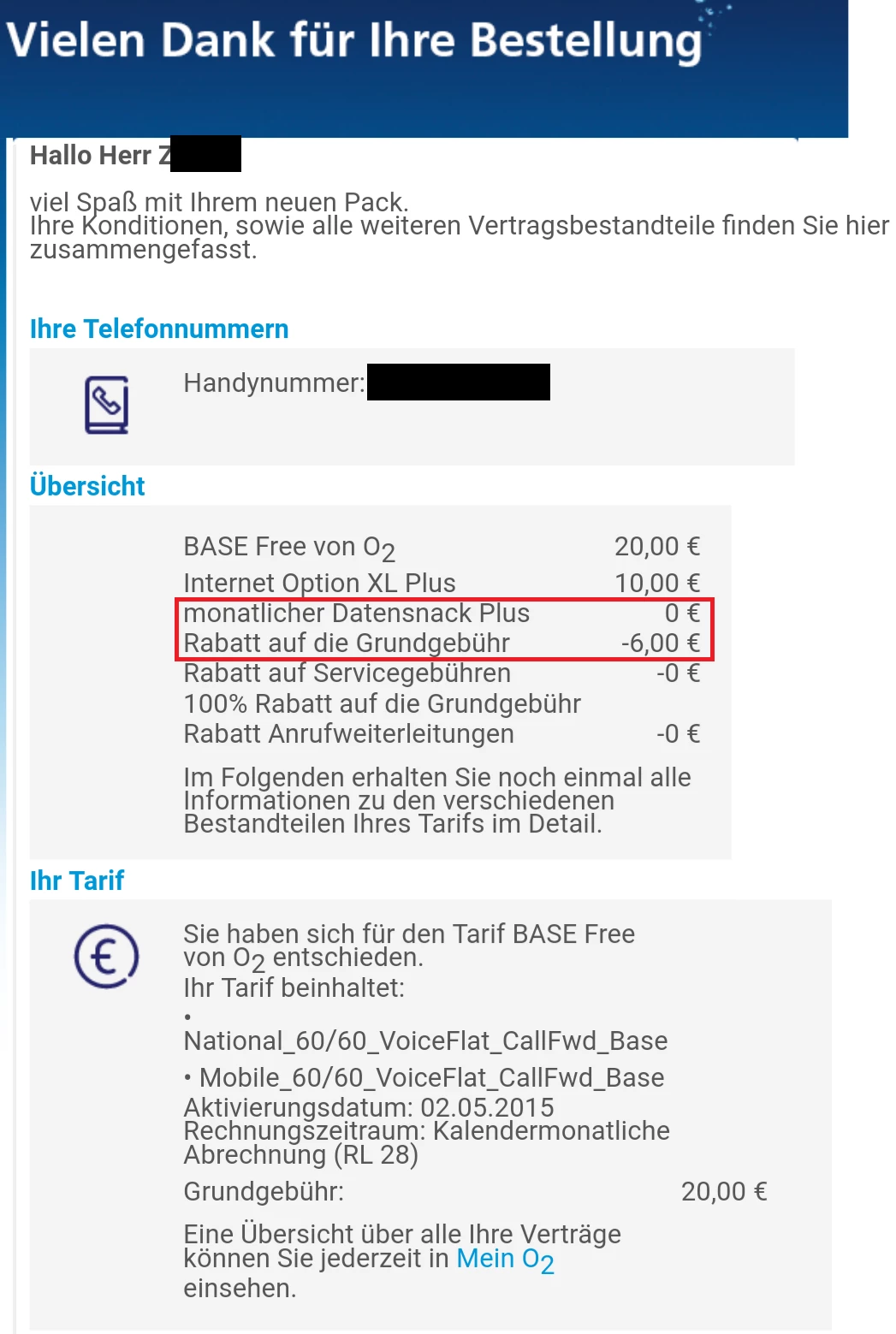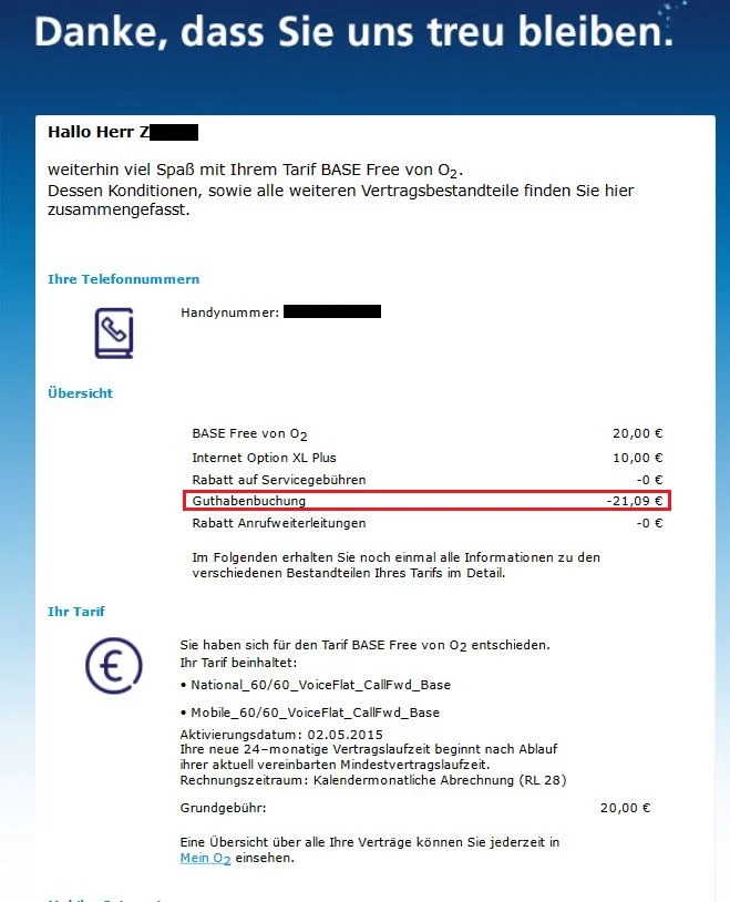 Alles in Allem ist also alles in allerbester Ordnung. Deine Rabatte gelten nach wie vor. Zusätzlich hast du von mir noch eine komplette Grundgebührenbefreiung bekommen und der Datensnack ist ebenfalls kostenfrei.