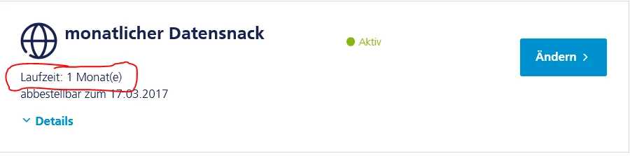 In mein O2 ist allerdings seitdem eine Laufzeit des 10-fachen Datensnack von 1 Monat statt der vollen Laufzeit angezeigt.