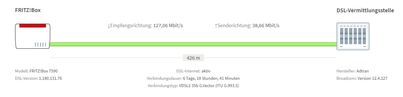 Ich nutze eine Fritz Box 7590 und ich empfange von der 450m entfernten Verbindungsstelle jedoch nur knapp 127 mbit (siehe Screenshot). Was muss ich hier tun? Liegt der Fehler bei o2 oder bei mir? Dann hätte ich auch einen kostengünstigeren L-Vertrag wählen können.