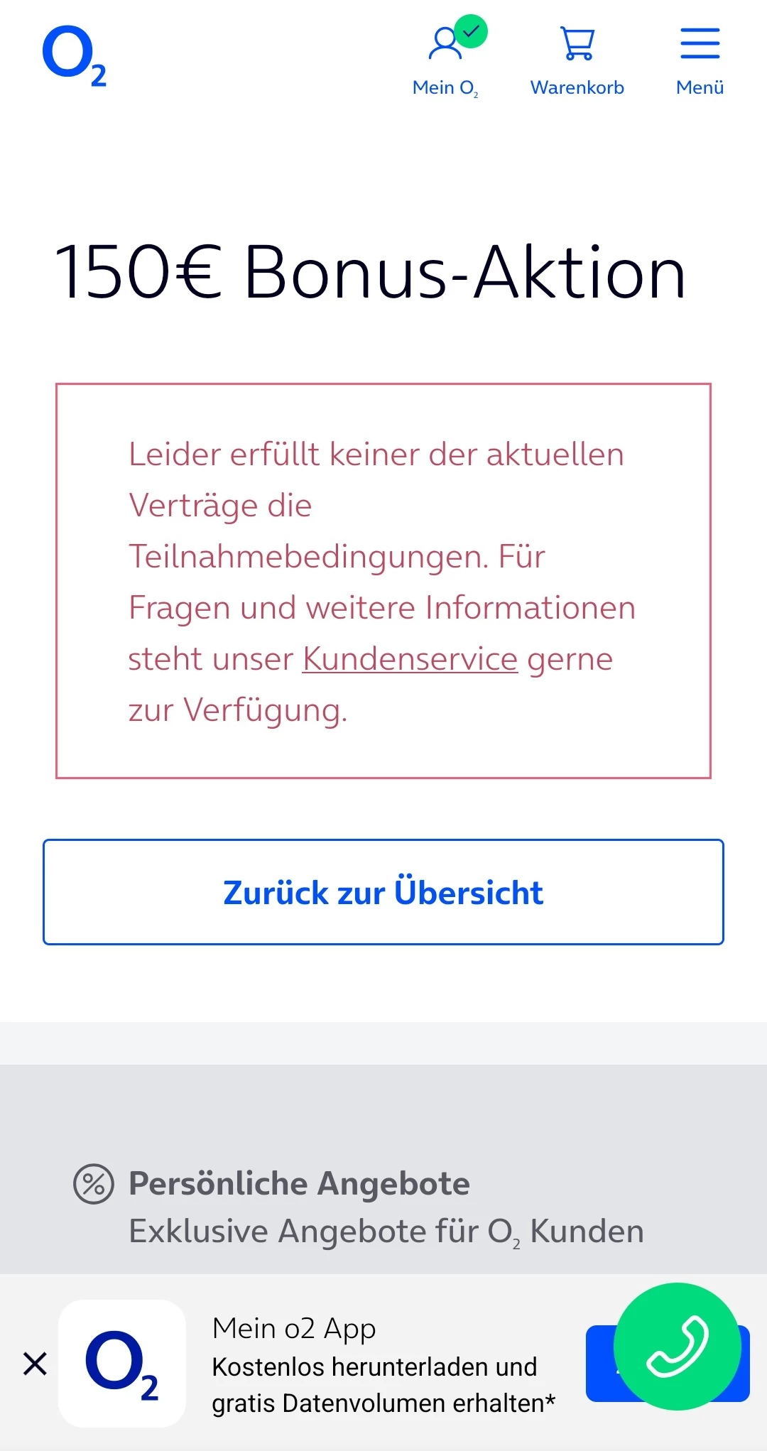 Mir stehen 150 € Wechselbonus zu (in der App korrekt ab 30.10.2025 hinterlegt). Allerdings habe ich nie eine SMS zur Einlösung erhalten und der Link zur Aktionsseite ( o2.de/mein-o2/bonus ) zeigt nur eine Fehlermeldung