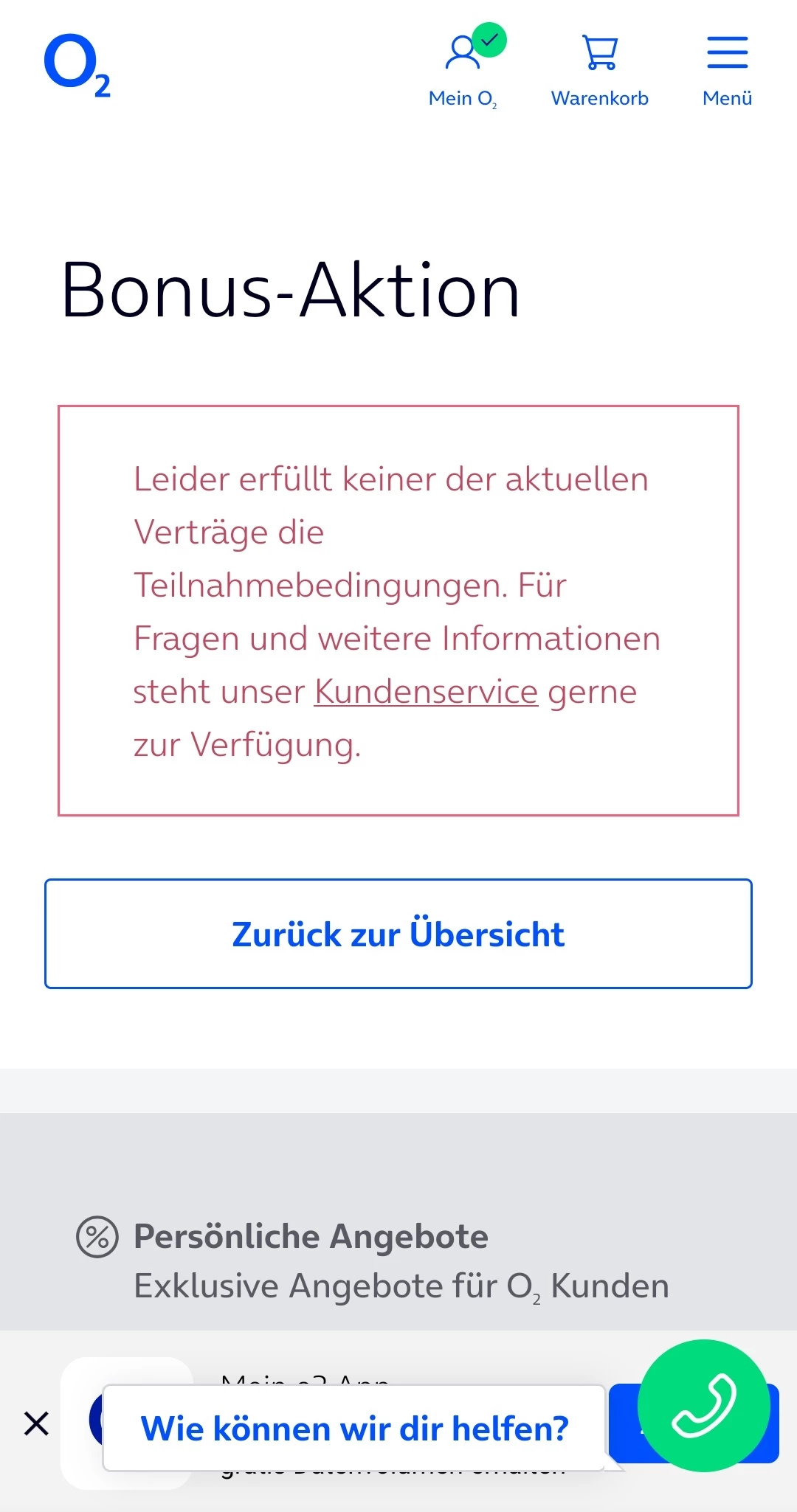 Leider erfüllt keiner der aktuellen Verträge die Teilnahmebedingungen. Für Fragen und weitere Informationen steht unser Kundenservice gerne zur Verfügung.”).
