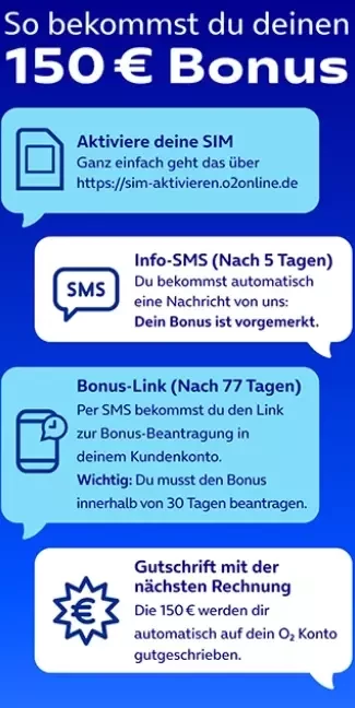 ich habe am 04.02.26 einen neuen O2 Vertrag über Gomibo abgeschlossen. Leider habe ich bis jetzt keine SMS erhalten bezüglich des 150€ Bonus. Was muss ich tun?