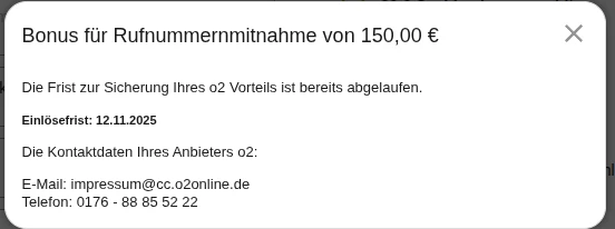 „Gemäß den im System hinterlegten Daten wurde Ihr Mobilfunkvertrag ohne einen Bonus in Höhe von 150 Euro am 13. Oktober 2025 bei Sparhandy abgeschlossen. Aus diesem Grund haben Sie keinen Link zur Registrierung des 150-Euro-o2-Bonus erhalten. Wir empfehlen Ihnen, sich direkt an die Händler vor Ort zu wenden, um Ihre Anfrage zu klären. “