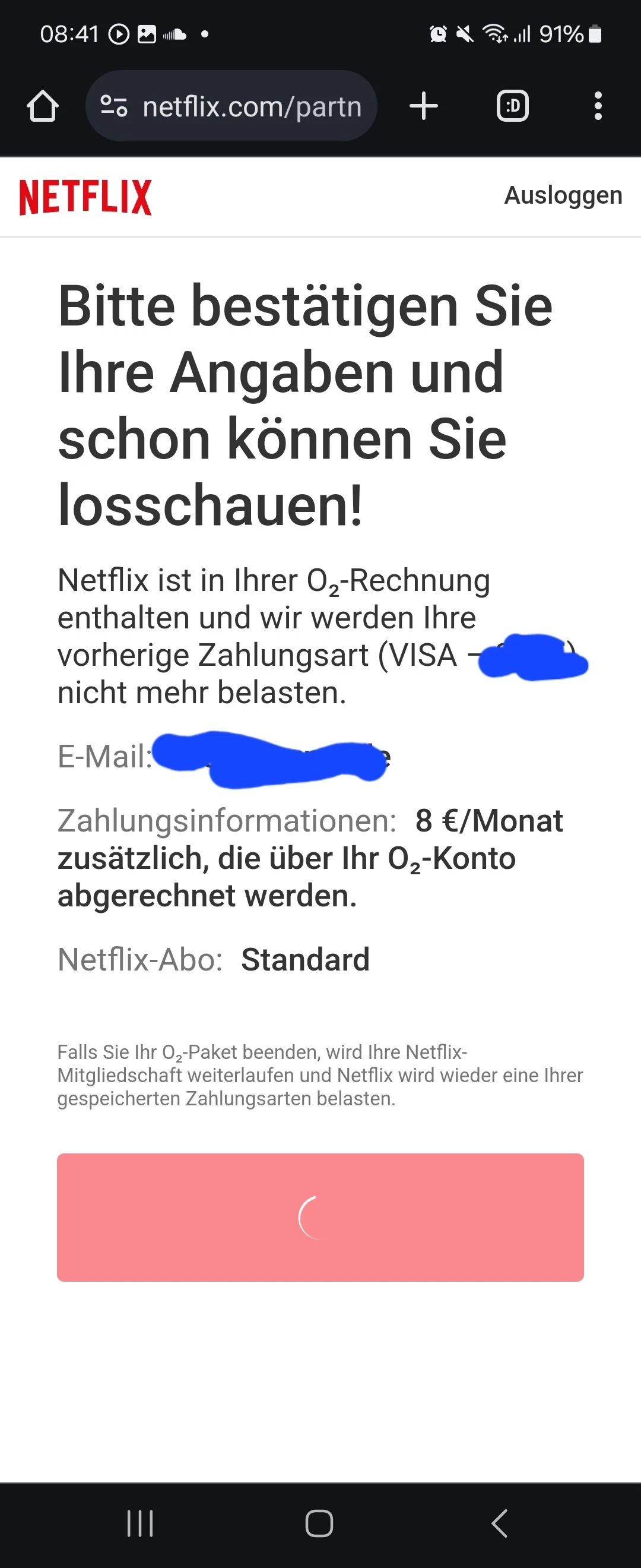 1. Ich habe überhaupt nichts geändert oder geupgradet. Sobald der Link im Priority Vorteil angeklickt wird, erfolgt automatisch die Verbuchung von “Netflix Standard mit Werbung” auf den O2 Vertrag. DANACH erhält man eine SMS von Netflix, in der man sich überhaupt erst einzuloggen (oder einen Account erstellen) bzw. das Abo-Modell auswählen kann.
