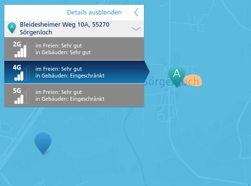Persönlich würde ich hier eh empfehlen, auf LTE statt auf 5G zu setzen. Denn zum einen ist 5G nur zum Teil in Sörgenloch verfügbar, und wenn dann nur draußen, und nicht im Gebäude: