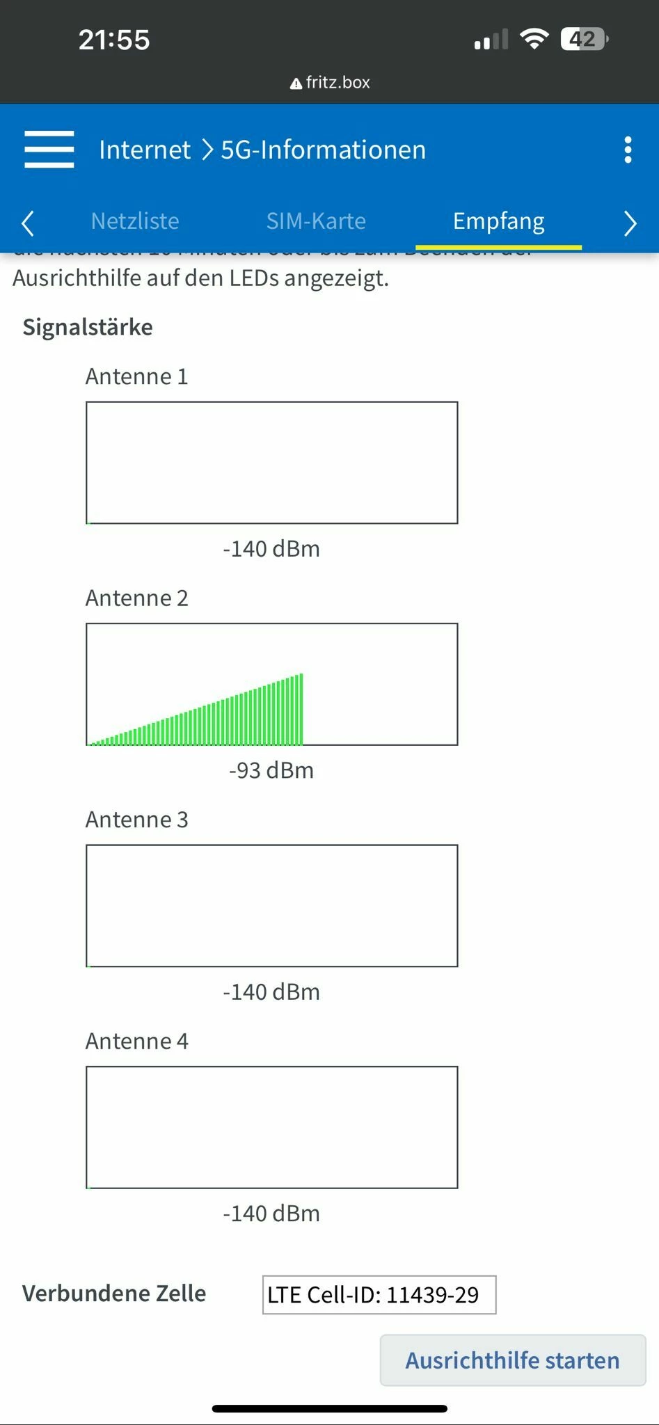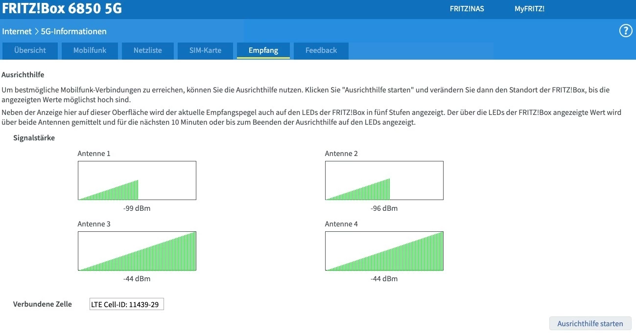 was mich hier etwas wundert, dass die Fritzbox den Empfangspegel nur auf einer Antenne anzeigt: