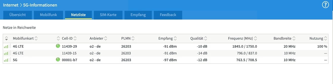 Und zudem zeigt die Fritzbox bei 5G keine korrekte Cell-ID an. Wenn du ausschließen kannst, dass es an der Fritzbox oder der angeschlossenen Außenantennen (?) liegt, und ähnliches auch bei deinen Smartphones auftaucht, wird ein Fehlerticket notwendig, welches ein Mod für dich erstellen kann.