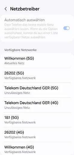 Auch die manuelle Wahl über Einstellungen/Verbindungen/Netzbetreiber funktioniert, wie man sieht: “Willkommen (5G)” ist nun mein “Aktuelles Netzt”…