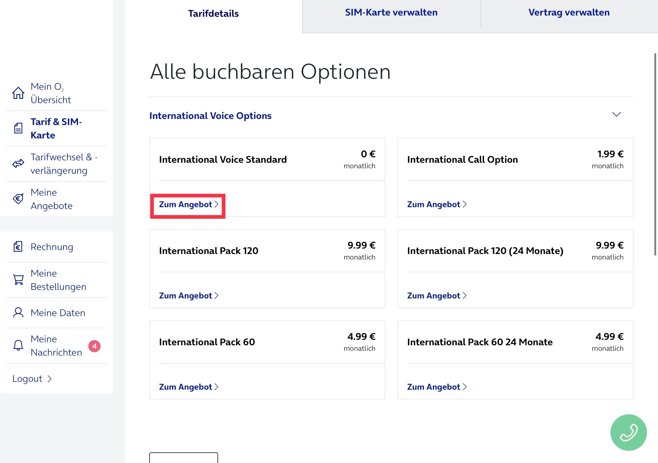 klicke auf Telefonie & SMS, und wähle das International Voice Standard Pack aus, damit bestellst du es ab.