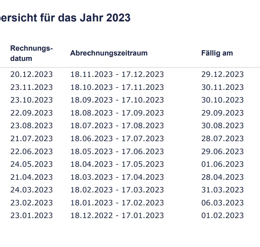 Der Mobil ( Geber ) läuft vom 6 bis 5ten und DSL vom 18 bis 17ten. Und wie man sieht ist der Abrechnungszeitraum immer vom 1 bis Letzten im Monat, Rechnungsdatum um den 5/6 und Abbuchung zwischen 10 bis 17.