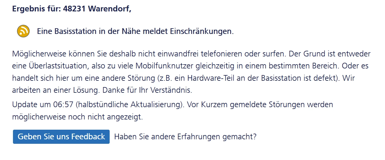 in Warendorf gibt es gerade einige Einschränkungen. Ganz aktuell vom 18.02.2022; dies betrifft leider GSM und LTE gleichermaßen. Arbeiten wurden bereits gestartet, ein Enddatum haben wir derzeit aber noch nicht. Hättest du noch eine Nebenstraße in der Nähe, welche wir Referenz nehmen können? Ich habe die Stöungsnummer bereits hinterlegt, damit du dich in der weiteren Kommunikation darauf beziehen kannst.