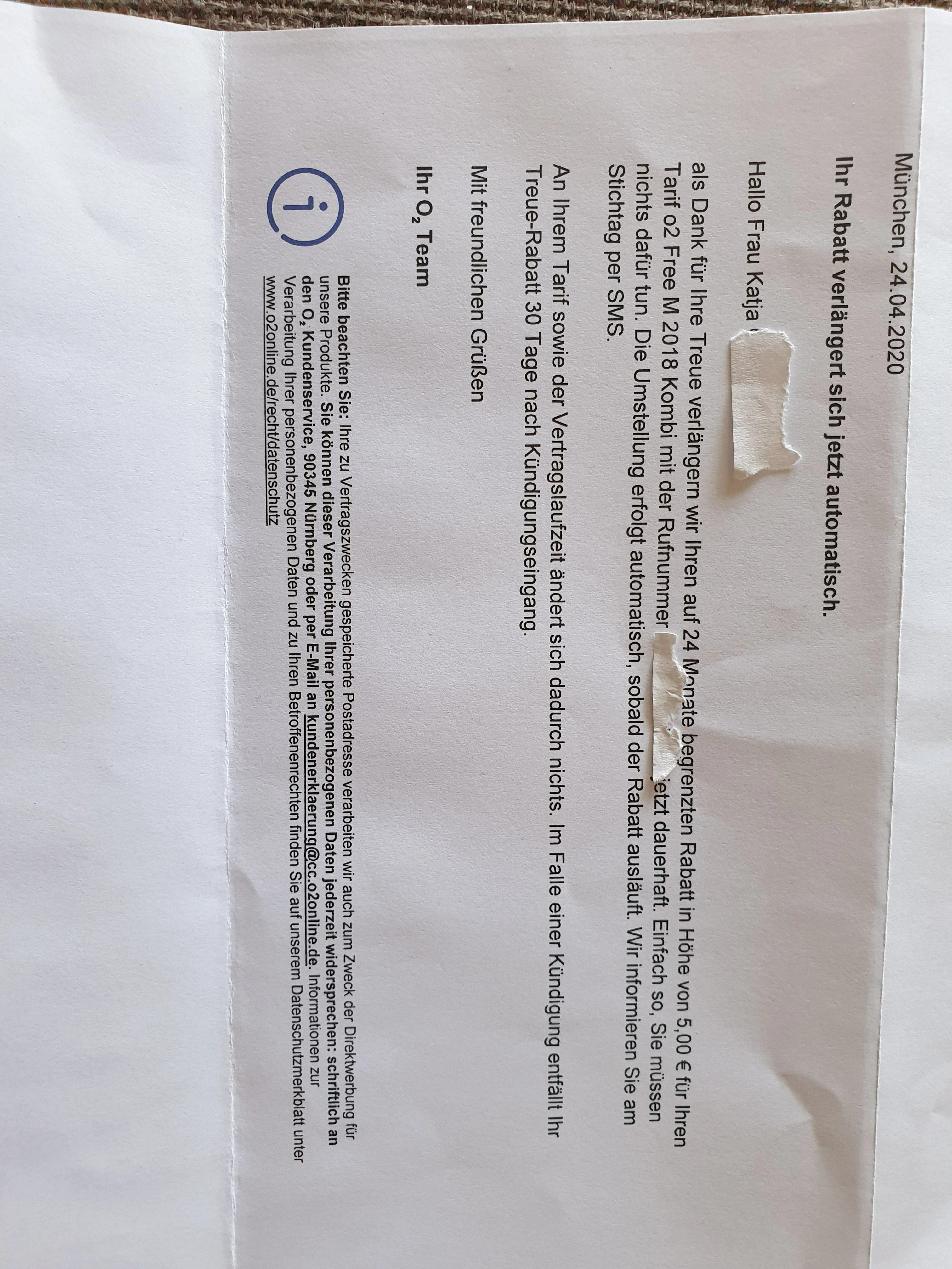 den Rabatt wirst du nicht erhalten. Der Brief wurde dir vor der Vertragsverlängerung geschickt, du hättest ihn bekommen, wenn du deinen alten Vertrag (dsen o2 Free M) nicht verändert hättest. Du hast inzwischen einen anderen Tarif mit neuen Rabatten erhalten und bei einer Vertragsverlängerung entfallen alle zuvor bestehenden Rabatte.