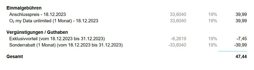 in der Regel sind unsere Mobilfunkverträge mit einem einmaligen Anschlusspreis von 39,99 €. Auch dein Vertrag ist mit diesem Anschlusspreis. Im ersten Monat hattest du ein unbegrenztes Datenvolumen gratis erhalten, dies ist der “O2 my data unlimited (1M) = 39,99 Euro” und dessen Rabatt sind die wieder abgezogenen “Sonderrabatt my Data unlimited (1m) = -39,99 Euro”.