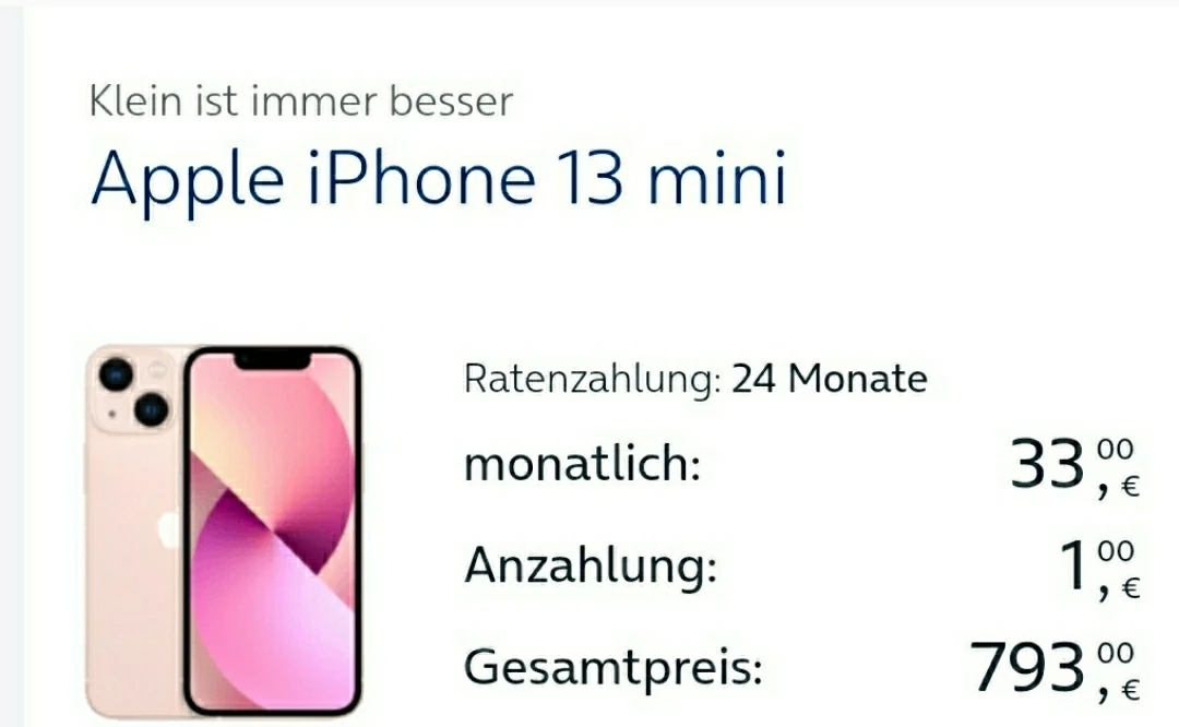 Das iPhone 13 Mini kostet ohne Tarif schon 33€ mtl Rate.. gesamt = fixpreis 793€