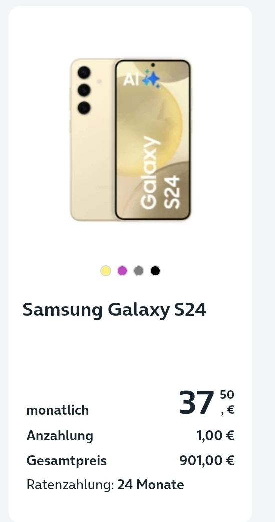 wir schauen gerne nach einem Angebot zu deinem Vertrag, da mag es dann auch durchaus bei einem ähnlichen Preis wie bislang bleiben. Wie Bollermann schon angebracht hat, sind die Kosten für den myHandy Vertrag davon dann jedoch noch separat. Und würden im Fall des S24 auch schon dein “Budget” sprengen. Wenn trotzdem ein Interesse besteht, dann nenne uns doch gerne noch welches Modell in welcher Farbe es sein soll.
