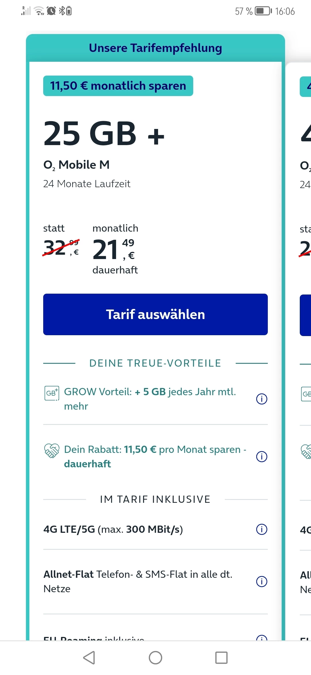 Das ist das Angebot was ich von O2 im Portal erhalten habe. Oder aber für 29,99 € mit zusätzlicher 25GB Partnerkarte. Gerade nochmal genauer geschaut, der O2 Free M mit 20 GB bekomme ich statt 29,99€ jetzt für 17,49€. Mein Treuevorteil dabei sind 24x12,50€ sparen.........