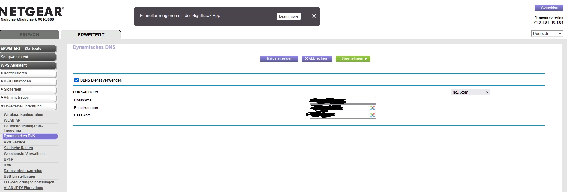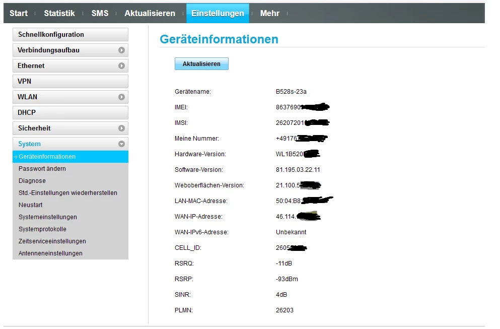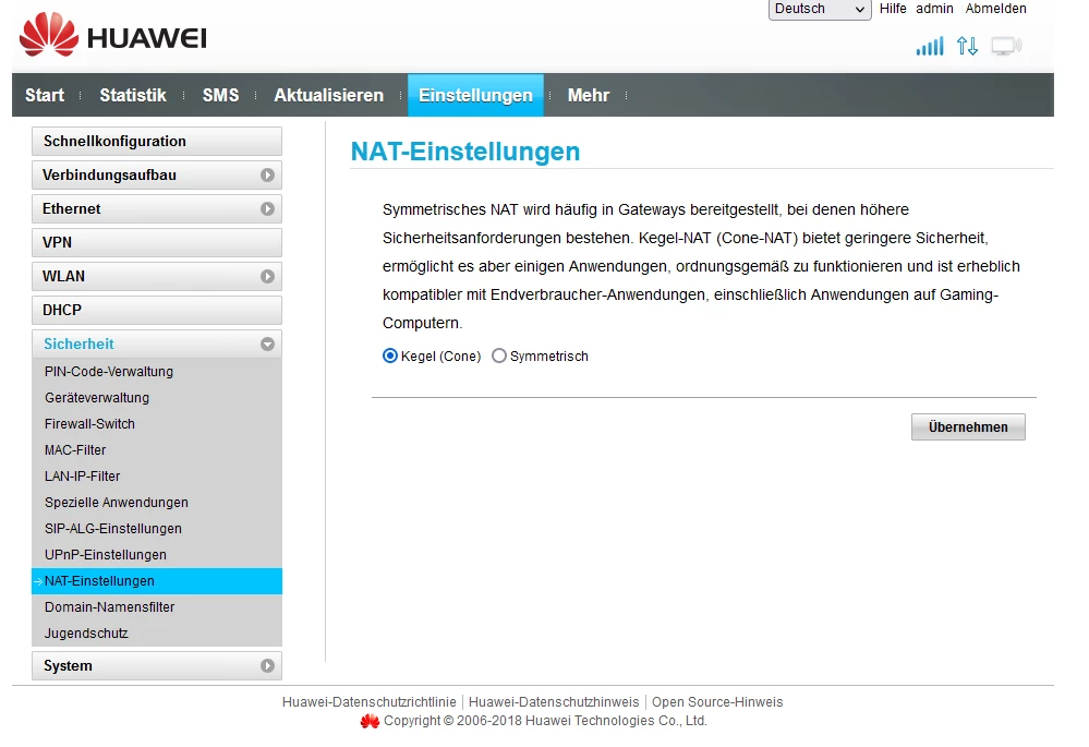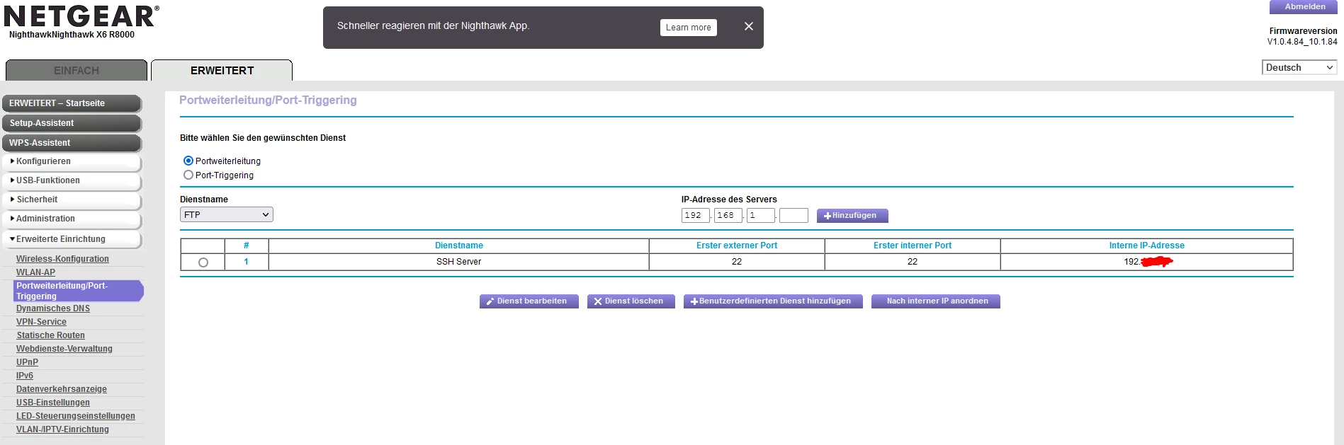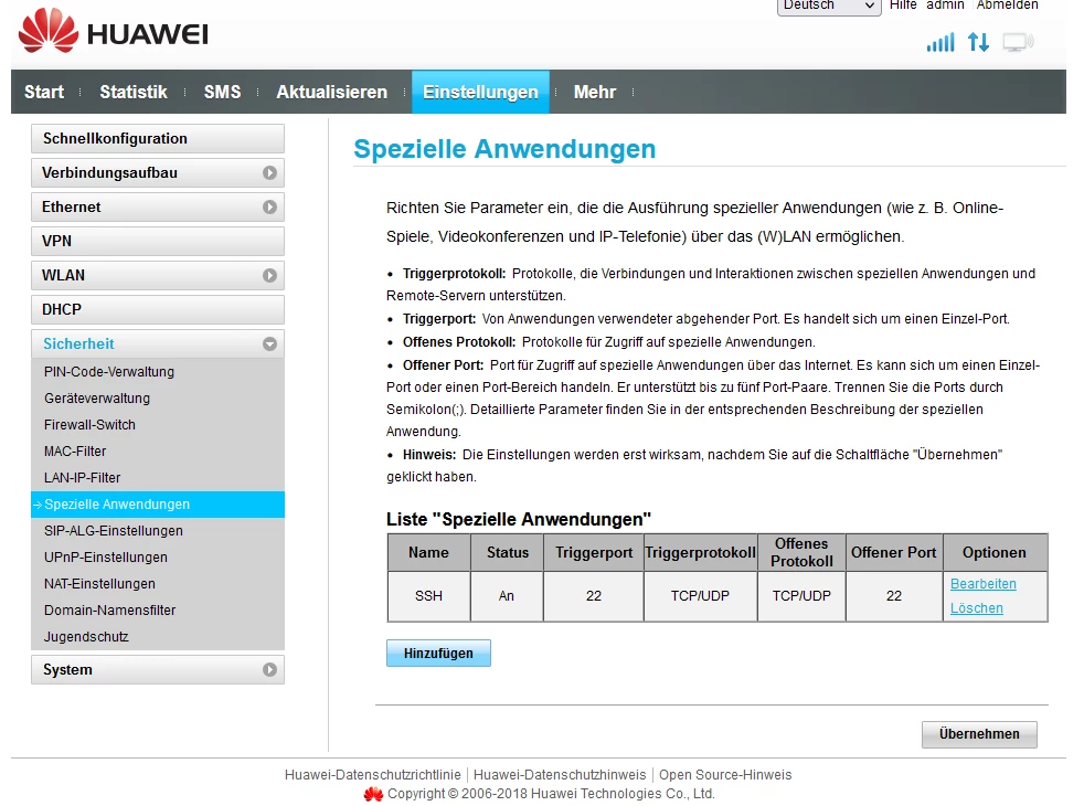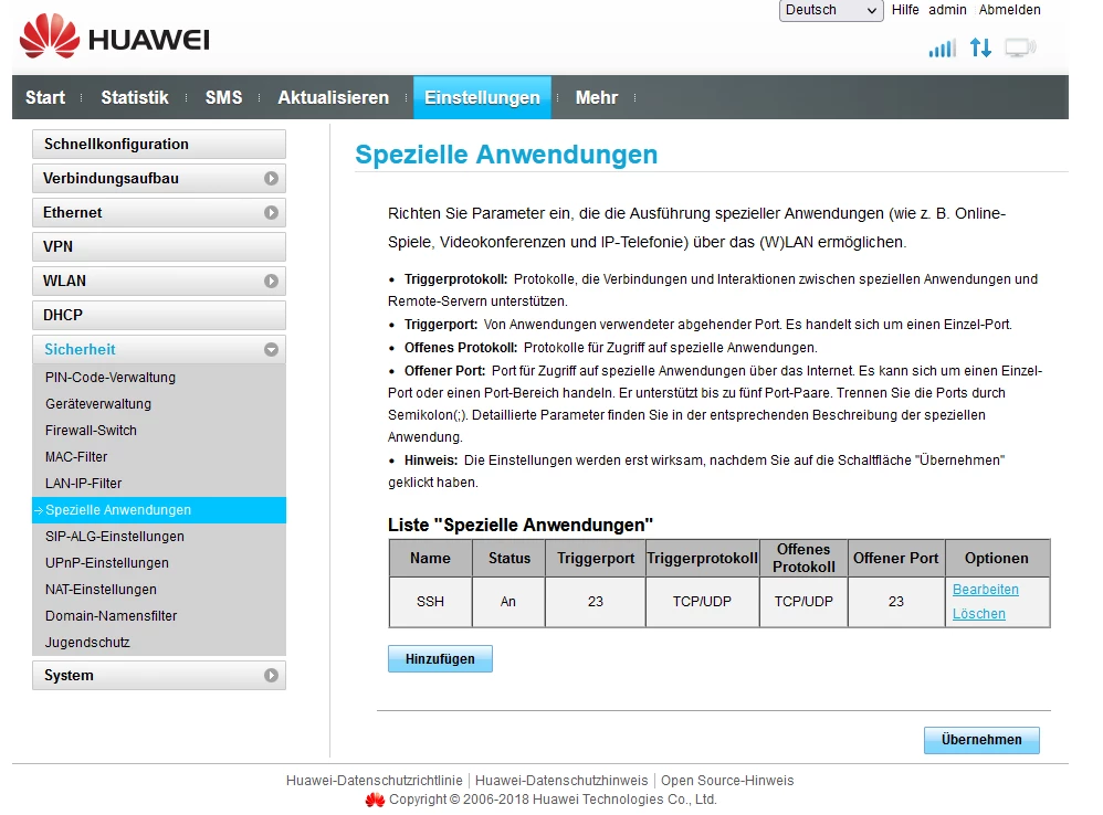 ich hab jetzt alles noch mal angeschaut und überlegt, der Plan sieht so aus im Huawei ( B528s-23a ) ist die Simkarte drinnen und der Huawei soll nur eins machen des ist des internet direkt an den Netgear ( R8000 ) weitergeben und der Netgear soll alles verwalten. ich hab gestern die ports beim Huawei angepasst und beim Netgear noch mal. Egal welche ports ich an mache was ich versuche keiner geht durch sei es auf dem Linux system kommt nix durch oder beim Hauptrechner Windows 11. ich gehe stark davon aus das des entweder daran ligt das der HUawei des garnicht kann oder ich auch wenn es nur eine einstellung ist falsch eingestellt habe ich werde auch alle fotos dauzu schicken was ich gemacht habe villeicht hat ja jemand eine lösung oder weiß wo der fehler einfach liegt. ich hab mir auch ein NO-IP ddns geholt wegen dem dauernten ip switch hab es jetzt nur zum test auf mein Windows 11 installiert wird aber wohl danach auf meinem linux server laufen. Der plan ist zurzeit nur das ich den Linux mit SSH aus der enfernung verbinde damit ich ihn zb neustarten kann oder mal updaten usw… mein bruder hat mir damals den server eingerichtet hat auch noch mal am server nachgeschaut und der port ist standart 22 und nach außen 23. Am Huawei hab ich die Firewall komplett ausgemacht. an beiden geräten ist UPnP an.