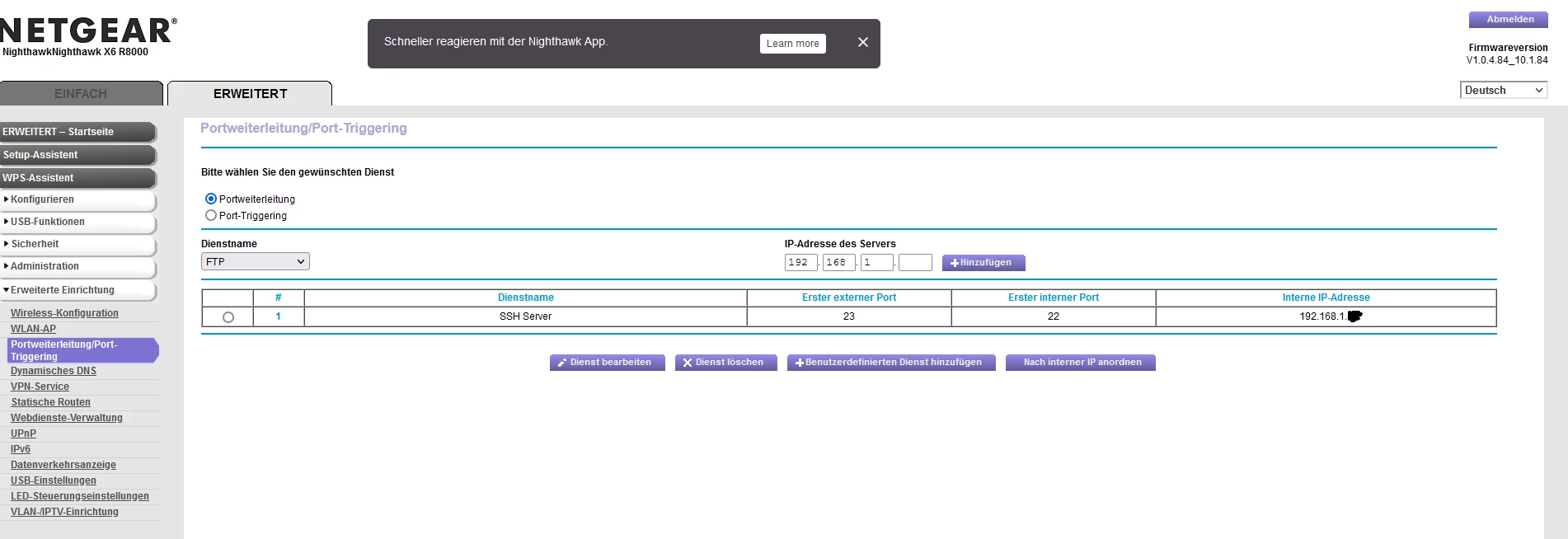 hab jetzt mal den port auf 22 eingestellt leider passiert da auch nix, bei NAT-Einstellungen kann man leider nix eintrage.