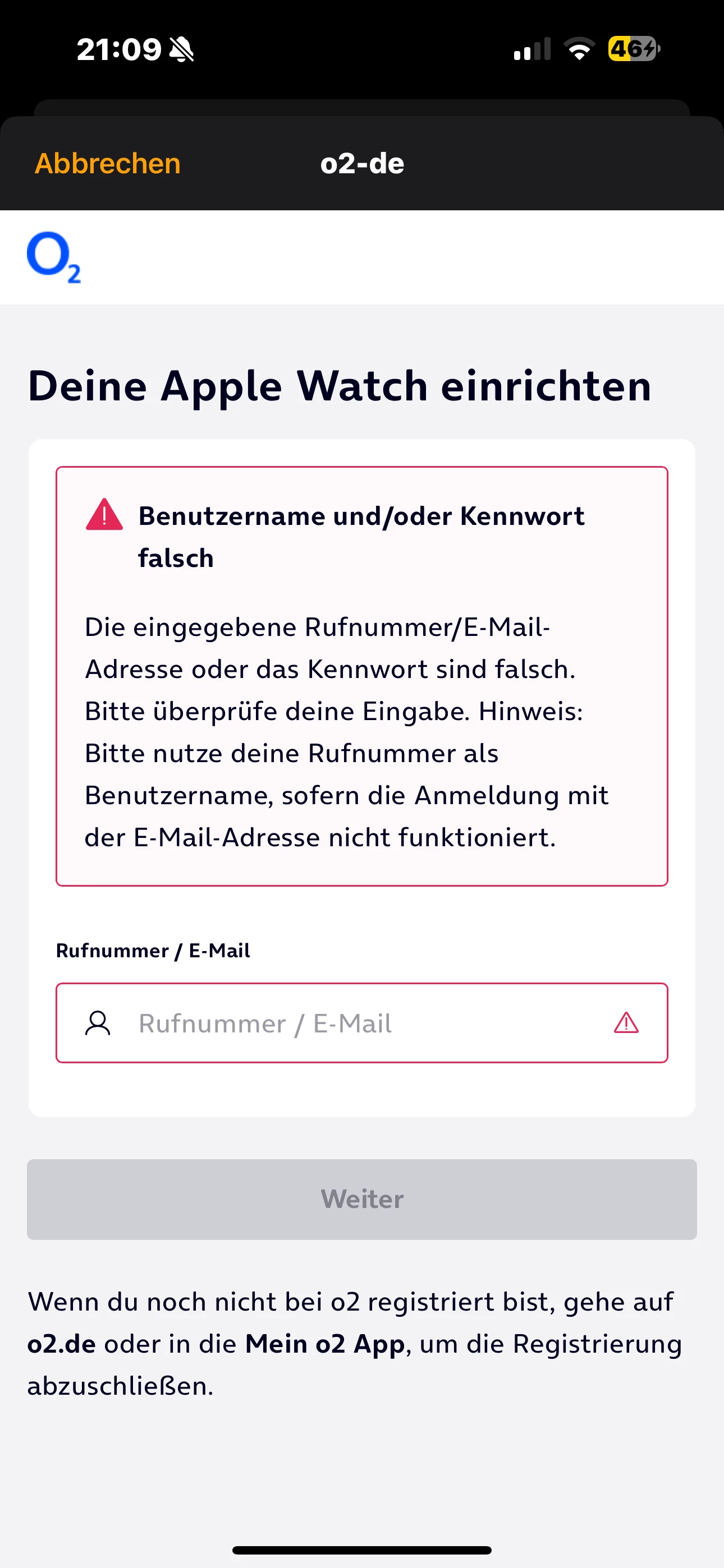 der Vorgang ist ja wie folgt: Watch App → Mobilfunk →  Mobilfunk konfigurieren→ und dann werde ich zum O2 Login weitergeleitet und da kommt der Fehler mit dem einloggen