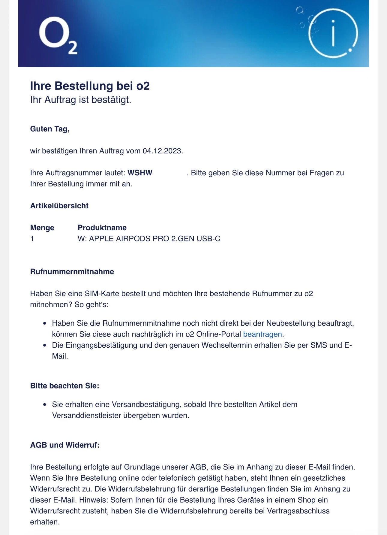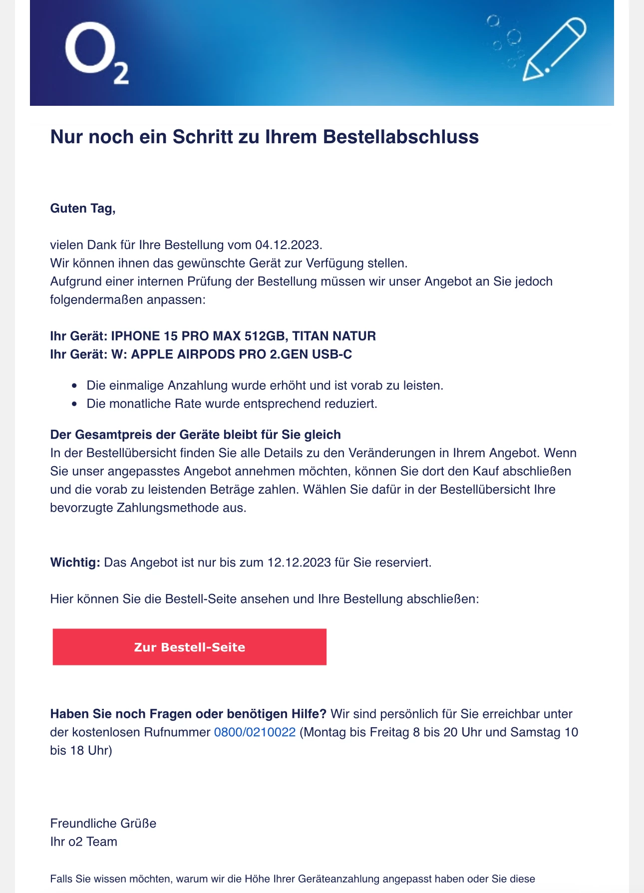 Es stellt sich heraus, dass ich gestern einen Antrag auf den Erwerb eines Mobilfunkanschlusses + iPhone 15 pro max + Airpods 2. Generation gestellt habe.