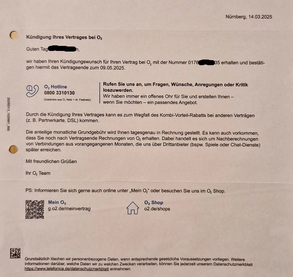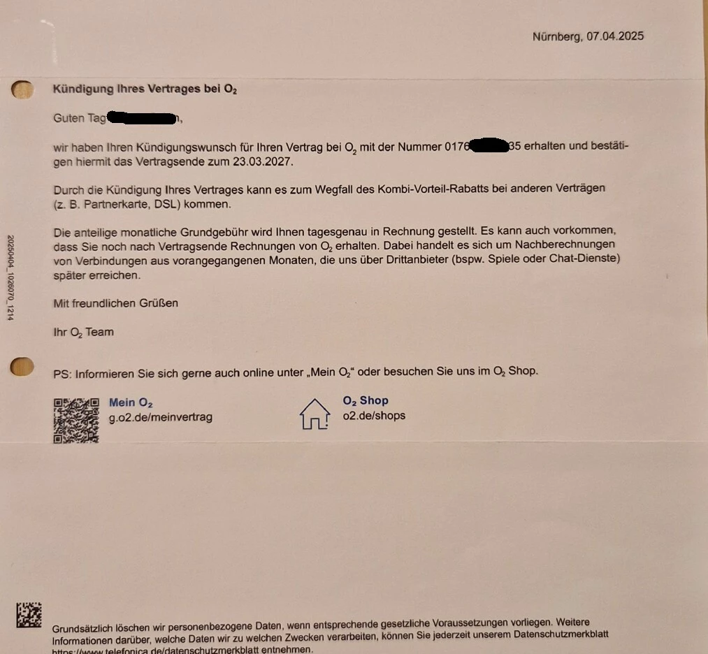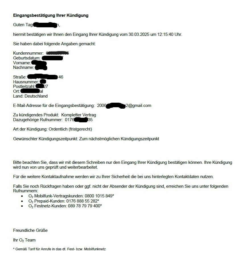 Vor zwei Jahren hatte ich zwei Verträge bei O₂. Ich habe alle Rechnungen vollständig bezahlt und beide Verträge nach Ablauf der Laufzeit fristgerecht gekündigt. Ich habe zwei Kündigungsbestätigungen von O₂ erhalten – alle alten Verträge wurden also offiziell beendet.