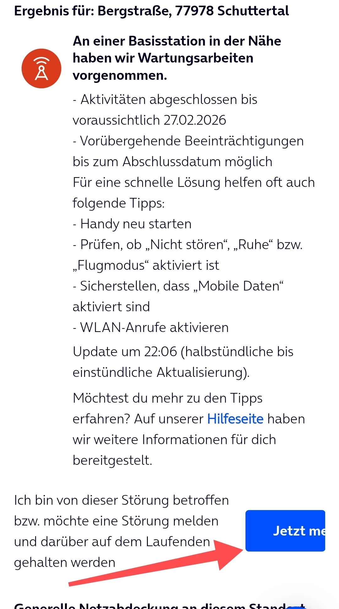 Die Arbeiten sollten voraussichtlich morgen abgeschlossen sein. Hattest du auch LTE only getestet und die Störung via jetzt melden Button gemeldet?