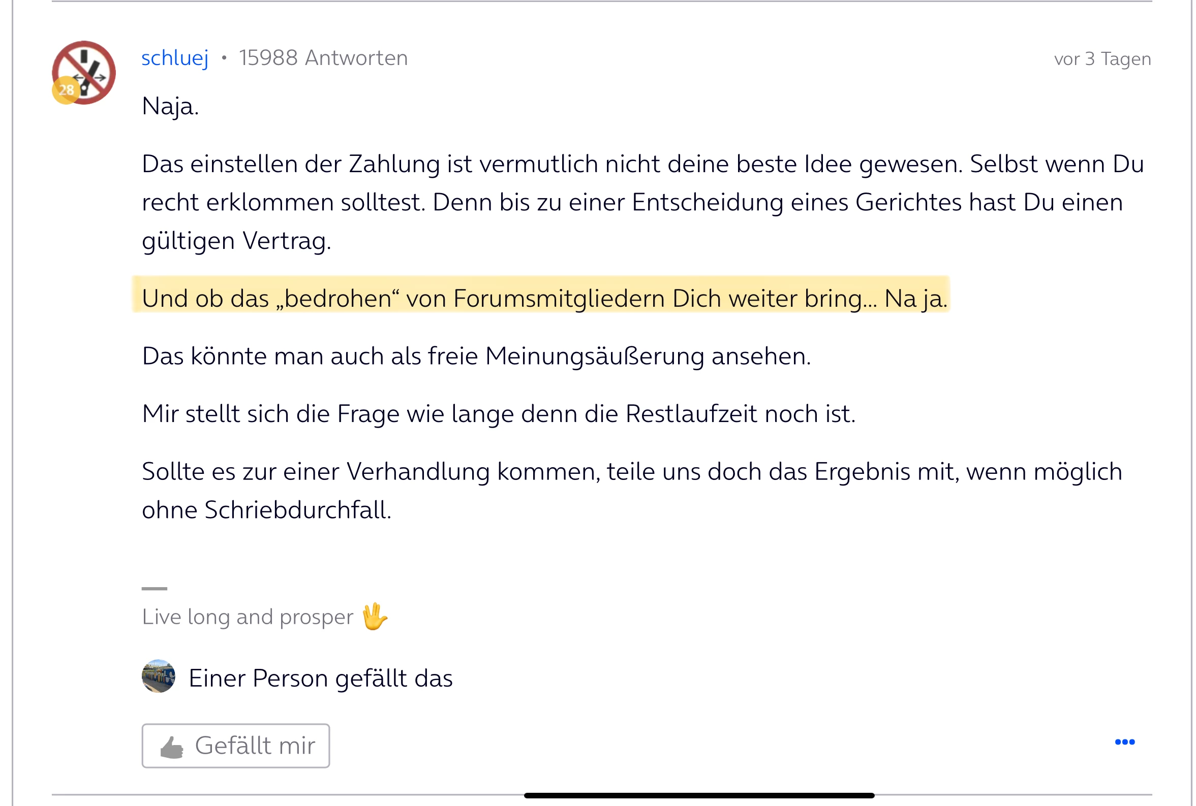 Bist du eigentlich an meiner weiteren Vorgehensweise interessiert, um vielleicht etwas für die Zukunft daraus mitzunehmen oder wartest du nur darauf, wieder deine Meinung über das Rechtliche abzugeben? 😅 Ernsthafte frage...nicht böse gemeint.