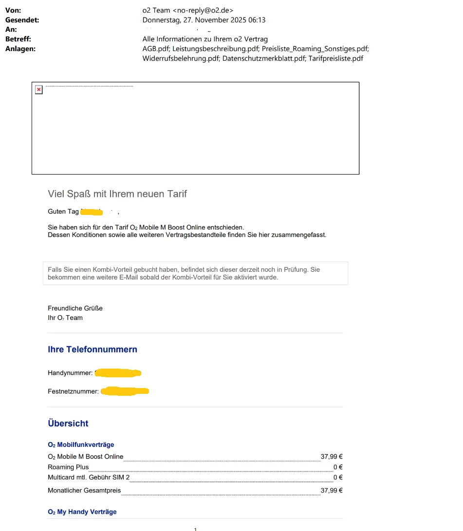 Nach 6 Wochen bekomme ich Briefe von O2 zu einem Vertrag und einer Nummer die ich nicht kenne und sehe dann in meiner Spam Mail das mir in der selben Minute ein zweiter Vertrag für 38€ aufgedrückt wurde.