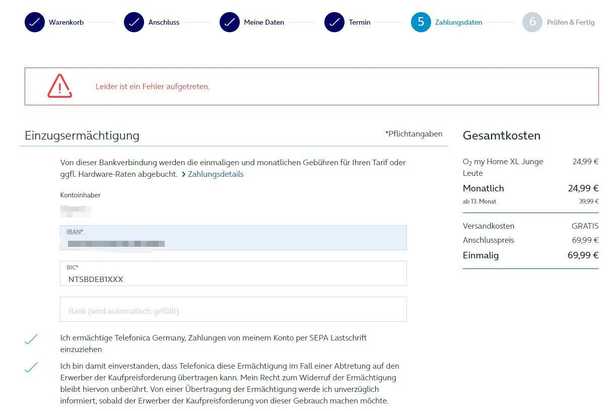 ich möchte O2 my Home XL Junge Leute (24 Mon.) bestellen aber die Bezahlung ist immer erfolglos. Ich habe E-Mail, Termin für Anschluss, Bankkonto(N26 Debitkarte und Commerzbank Girokonto) zu ändern, aber funktioniert nicht. Ich versuche es morgen noch einmal, aber kann ich diesen Vertrag auch anders bestellen, zum Beispiel ein Formular ausfüllen?
