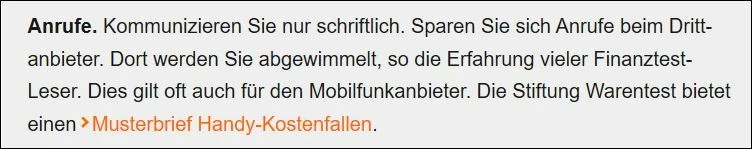 Das stimmt so allgemein und pauschal nicht. In Deinem Link empfiehlt Stiftung Warentest im Zusammenhang mit Drittanbieter-Abo-Fallen mit den Drittanbietern nicht telefonisch zu kommunizieren. Bezüglich der Mobilfunkanbieter wird das nicht “eindringlich” und schon gar nicht generell empfohlen, sondern nur im Zusammenhang mit den Abo-Fallen: