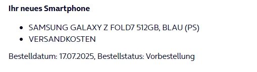 @Manuel A. nicht die Kontenance verlieren. Wir behandeln uns hier respektvoll. Deine Frage war: wo sind die Geräte. Die richtig Antwort darauf war: “das kann dir keiner sagen” und O2 wartet auf Wareneingang. Sobald die Geräte eingetroffen sind, bekommst du deines. Der Lieferstatusunterschied hängt schlichtweg nicht nur vom Fold/Flip 7 ansich ab, sondern auch von den Farben und vom  Speicher.  Deshalb kriegen manche ihre Bestellungen vor dir, die erst später bestellt haben. Ich denke mal, dass zB schwarze Geräte schneller ausgeliefert werden können, als zB blaue. Samsung soll wohl Lieferschwierigkeiten gehabt haben.