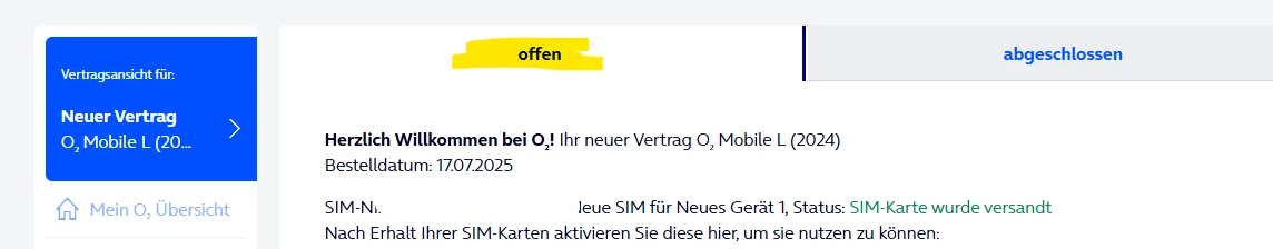 Die SIM Karte (die bereits angekommen ist) steht auf offen. Egal wo ich schaue ich bekomme einfach keine genaueren Infos