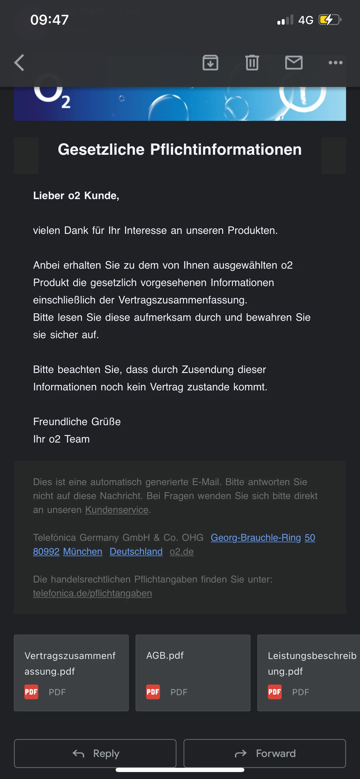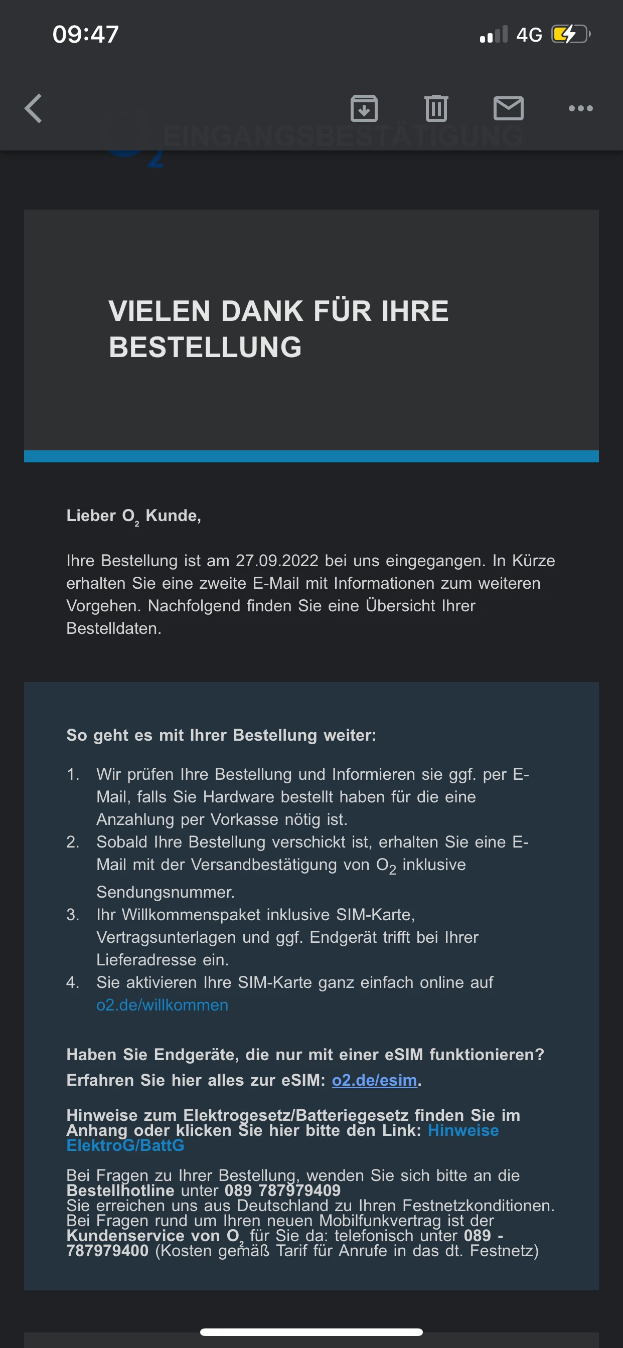 Ich habe online bestellt. Es war ein neue Vertrag. Ich war bei o2 letztes Jahr Juni und schon gekündigt . Jetzt warte ich auf weitere Email aber kommt nichts. Anhang sind die Emails was ich bekommen habe.