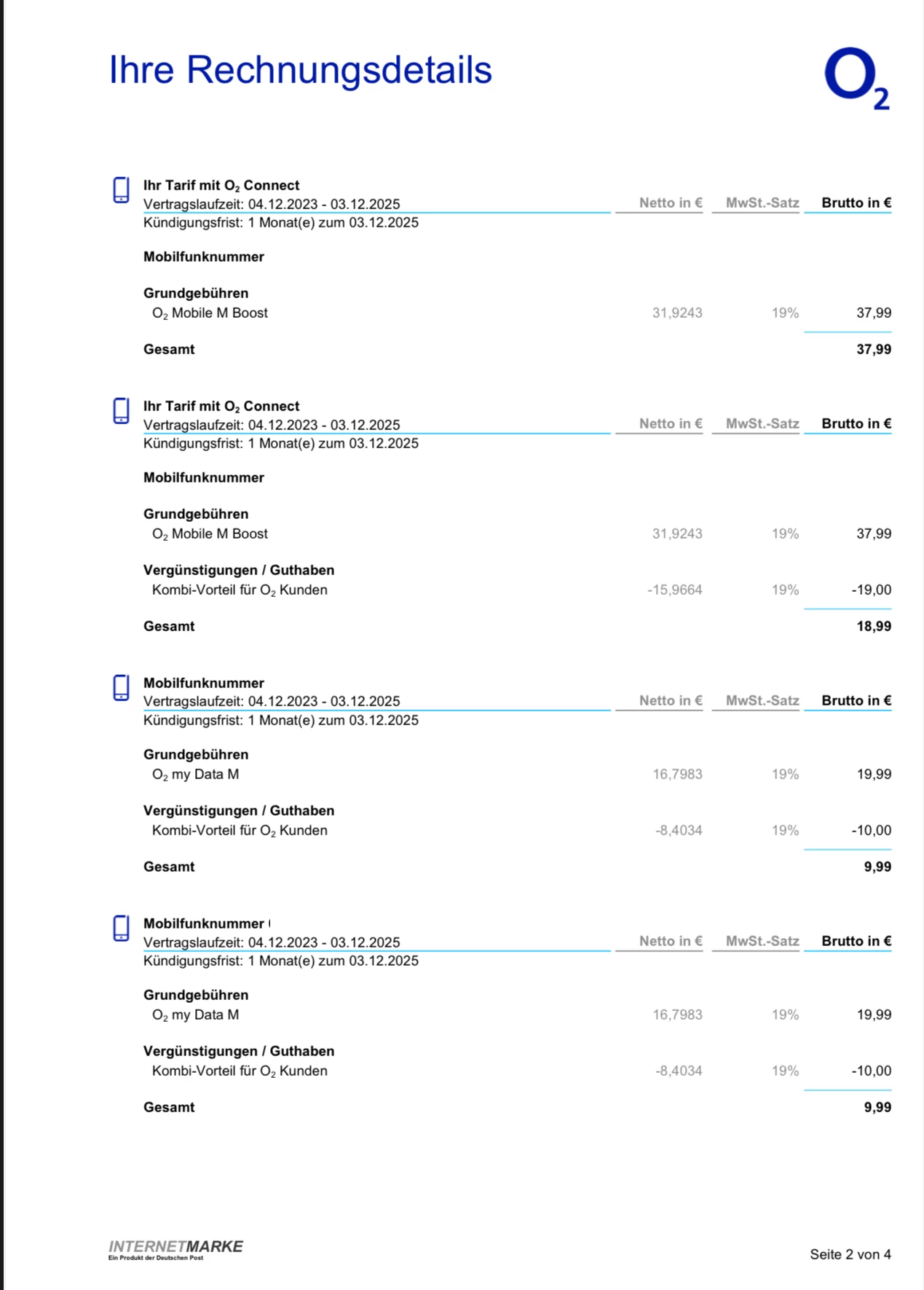 Zudem hast du 2 Data Tarife für je 19,99 ./. 10€ Kombivorteil = 9,99€, die es nicht gratis gibt. Diese kannst du zum Ende der Mindestvertragslaufzeit 12/25 kündigen.