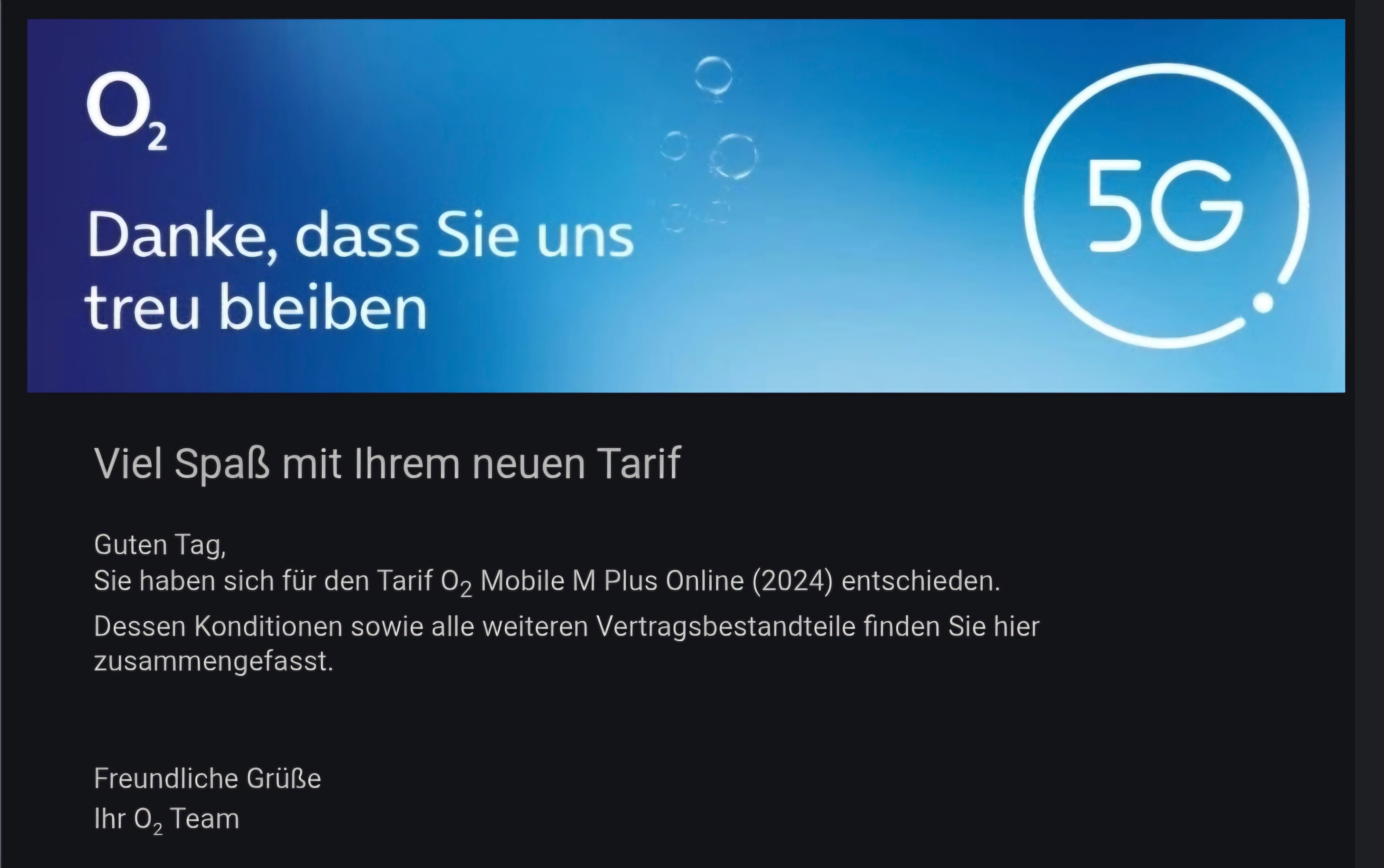 Da mein Mann und ich die gleiche Email Adresse haben sprach er mich heute auf eine Email von o2 an die ihm per Zufall beim durchschauen der Emails aufgefallen war und fragte mich weshalb ich meinen Vertrag dazu noch ohne neues handy zu deutlich schlechteren Konditionen verlängert hätte.