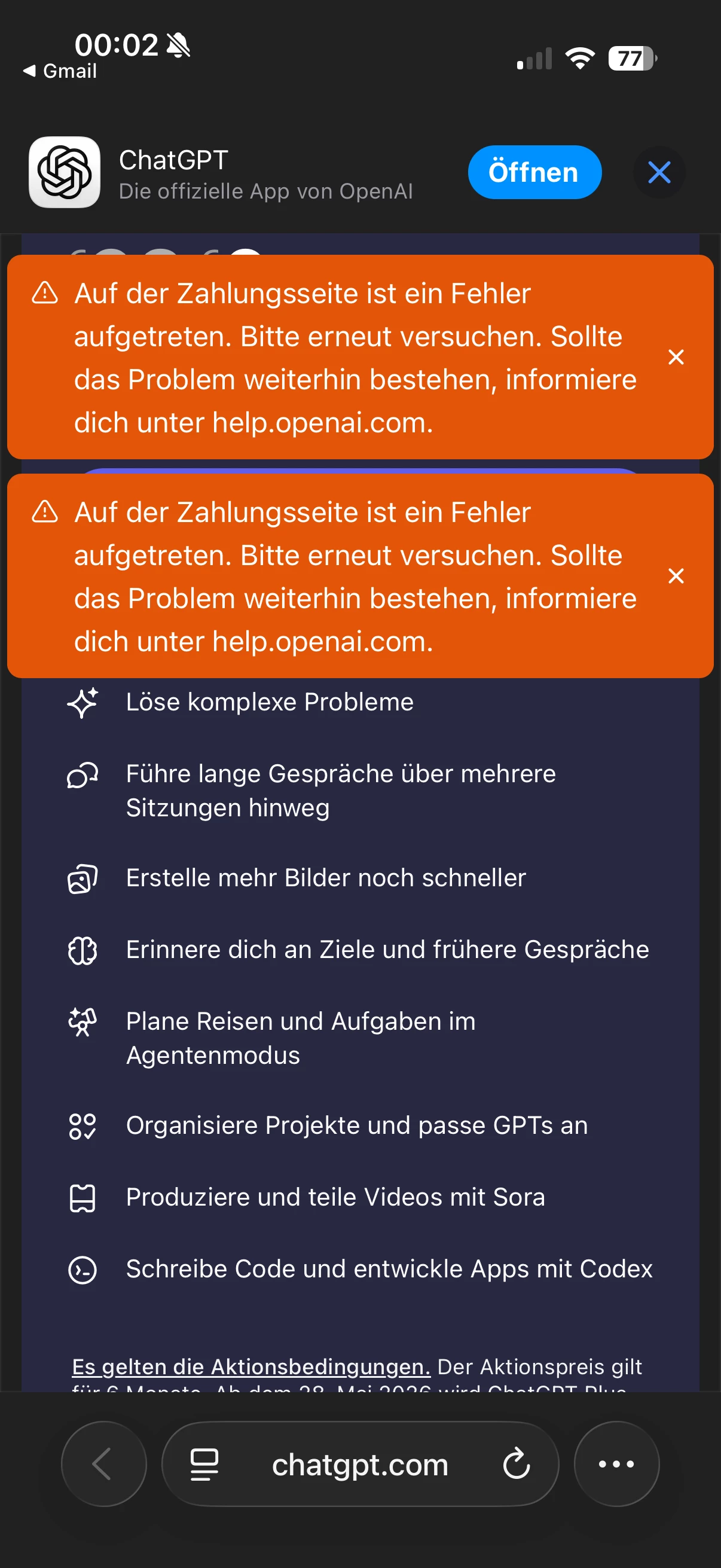 Servus, ich habe ein Vertrag bei O2 gemacht und 6 Monate gratis Chat Gpt bekommen. Aber ich kann es nicht einlösen da die Zahlung die ganze Zeit fehlschlägt.
