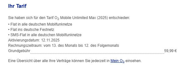 vielen Dank für deine Antwort. Bestellung habe ich über Check24 am 03.11.2025 abgegeben, Bestätigung von O2 sowie der Aktivierungsdatum sind beide 12.11.2025.