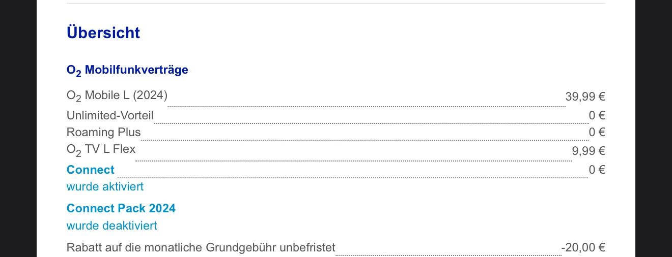 Da ich eine Multikarte fĂŒr meine Apple Watch habe, hat er online bei dem Wechsel vom Mobile XL auf den Mobile L selbststĂ€ndig die Connect-Option eingepflegt. Ich habe die Meldung vorher gesehen, dass die Bestellhotline die Connect-Option beim Wechsel auf den Mobile L auf kostenfrei umstellen kann, aber leider meinte der Mitarbeiter, dass er in seinem System mir das Angebot mit Mobile L fĂŒr 19,99 € gar nicht anbieten kann. Deswegen habe ich das Angebot selber online wahrgenommen. Es wĂ€re echt cool, wenn ich die Option wieder gratis hĂ€tte, wie das vorher mit dem Boost-Tarif der Fall war. 🙂