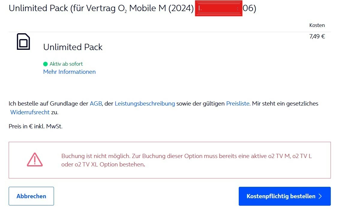 @o2_Kathi die Vertragsumstellung vom Free M zum Mobile M hat erfolgreich geklappt. Jetzt wollte ich das Unlimited Paket für 7,49€ monatlich dazubuchen, aber immer wenn ich auf “kostenpflichtig bestellen” klicke, kommt danach die Meldung es muss erst o2 TV gebucht werden. Hab ich gemacht. Aber die Meldung kommt trotzdem wieder. Kannst du es für mich einbuchen? LG