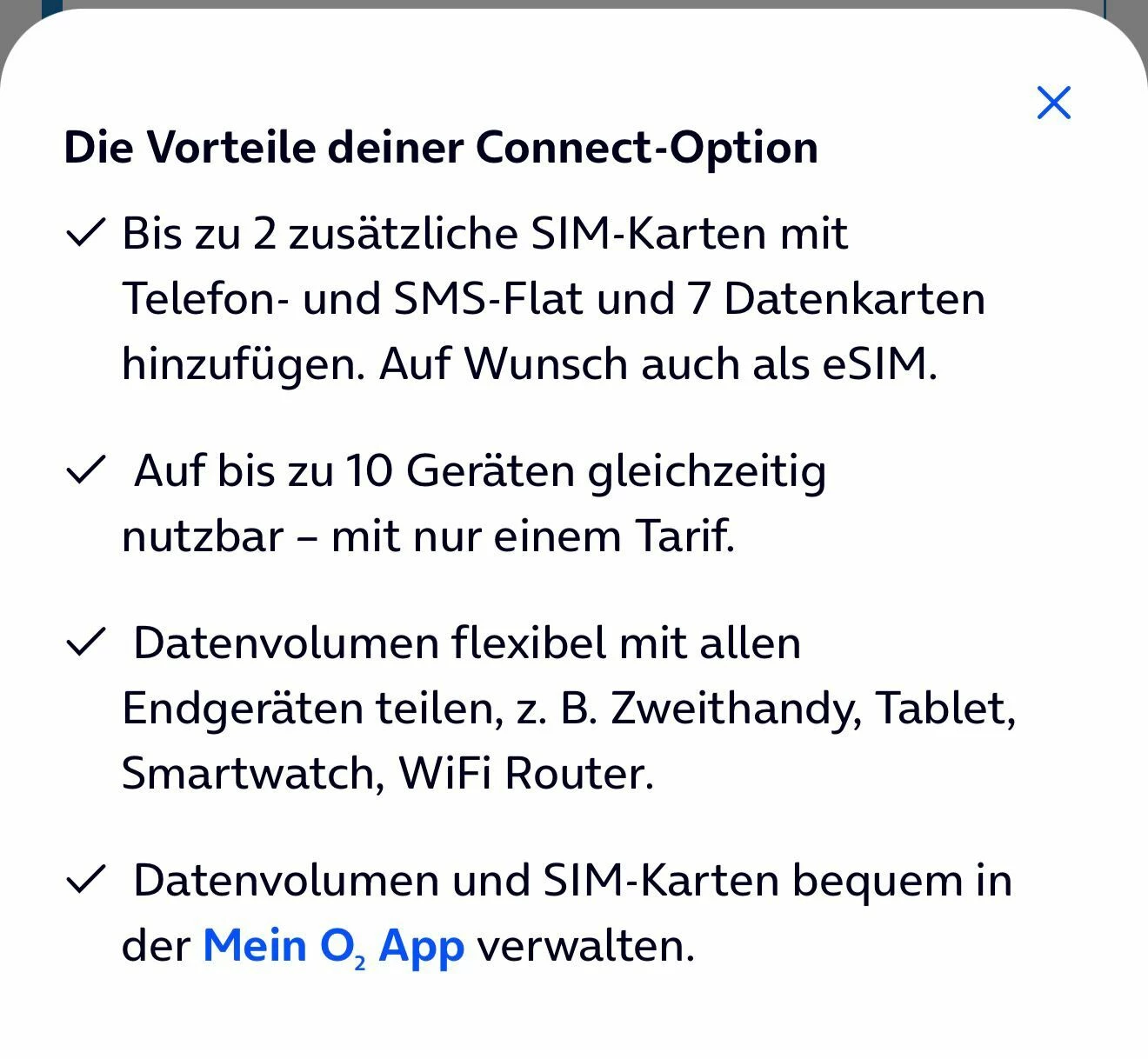 Wie ich hier bereits gelesen habe, wurden für eine Vertragsverlängerung auf den Tarif O2 Mobile Unlimited Max 2025 mit drei hundert Megabit pro Sekunde schon Angebote über die Community erstellt, in denen die Connect Option kostenlos bleibt. Dieser Hinweis erscheint auch in der App und ich habe ihn selbst gesehen.