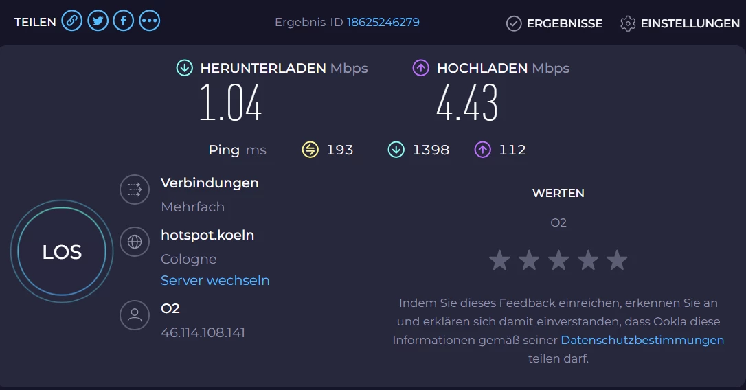 ich bin seit heute Morgen 8:45 Uhr am Dokumentieren, ich komme leider nie über die Dowloadrate von 2 Mbit´s. Ich lade euch ein Screenshot von Oakla Hoch. Ich habe im vergleich einfach mal mein Telekom Netz auch getestet und beigefügt. Also kurz gesagt ​@Alex-Trust kann ich hier nichts im Alltag nutzen, ich habe sogar probleme mit Whatsapp, und das bedeutet schon was.