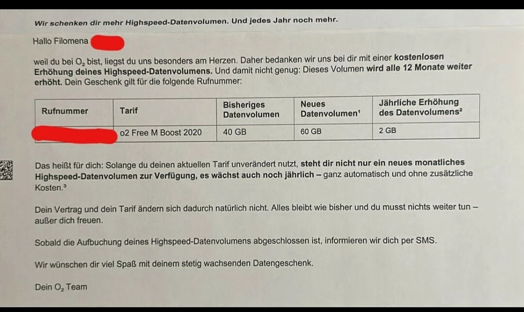 Halloo, ich bekam vor paar Monaten von O2 per Post die Mitteilung, man würde mein Datenvolumen von 40Gb bis 60Gb erhöhen, ohne nichts zu tun. Aber bis jetzt bleibt meine Datenvolumen auf 40Gb. Wie lange muss ich warten bis die Datenvolumen geändert? Vielen Dank