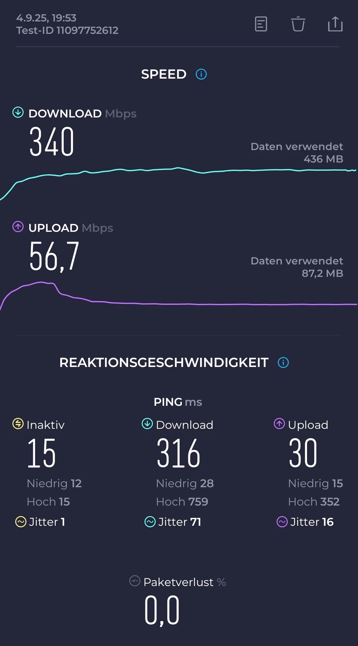 Ganz frisch getestet. o2 kann durchaus auch mehr als 50 Mbit/s 😊