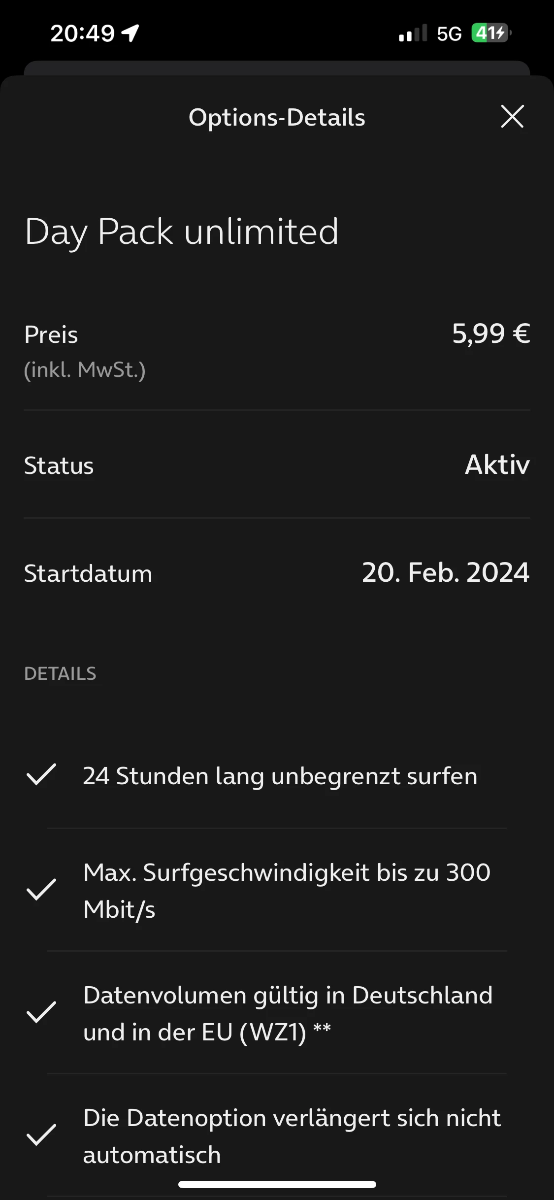 Hallo Leute, hatte am 20.02.2024 das Day Pack unlimited gebucht gehabt. Mittlerweile sind es schon fast zwei ganze Monate vergangen und ich habe immer noch grenzenloses Daten Volumen. Wir haben heute den 01.04.2024 und nein es ist wirklich kein Aprillscherz!. Es steht da drauf das es sich automatisch deaktiviert und ich habe jetzt keine Lust zusätzlich (40x5,99 = )239€