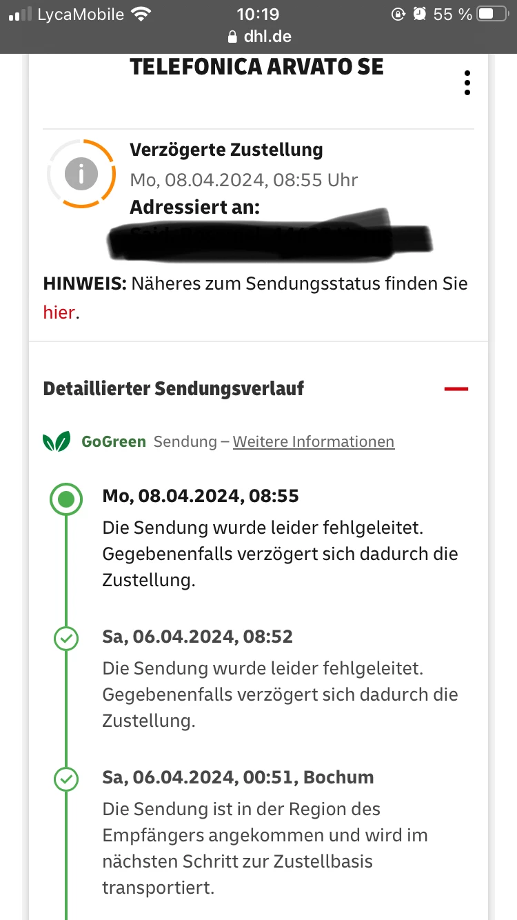Hallo ich habe eine problem mein Handy sollte am Samstag kommen und ist nicht gekommen wegen einer fehlleitung von dhl und heute sollte es wieder kommen und wurde wieder fehlgeleitet und jetzt ist die Frage was kann ich machen denn dhl meinte ich sollte mich bei o2 melden