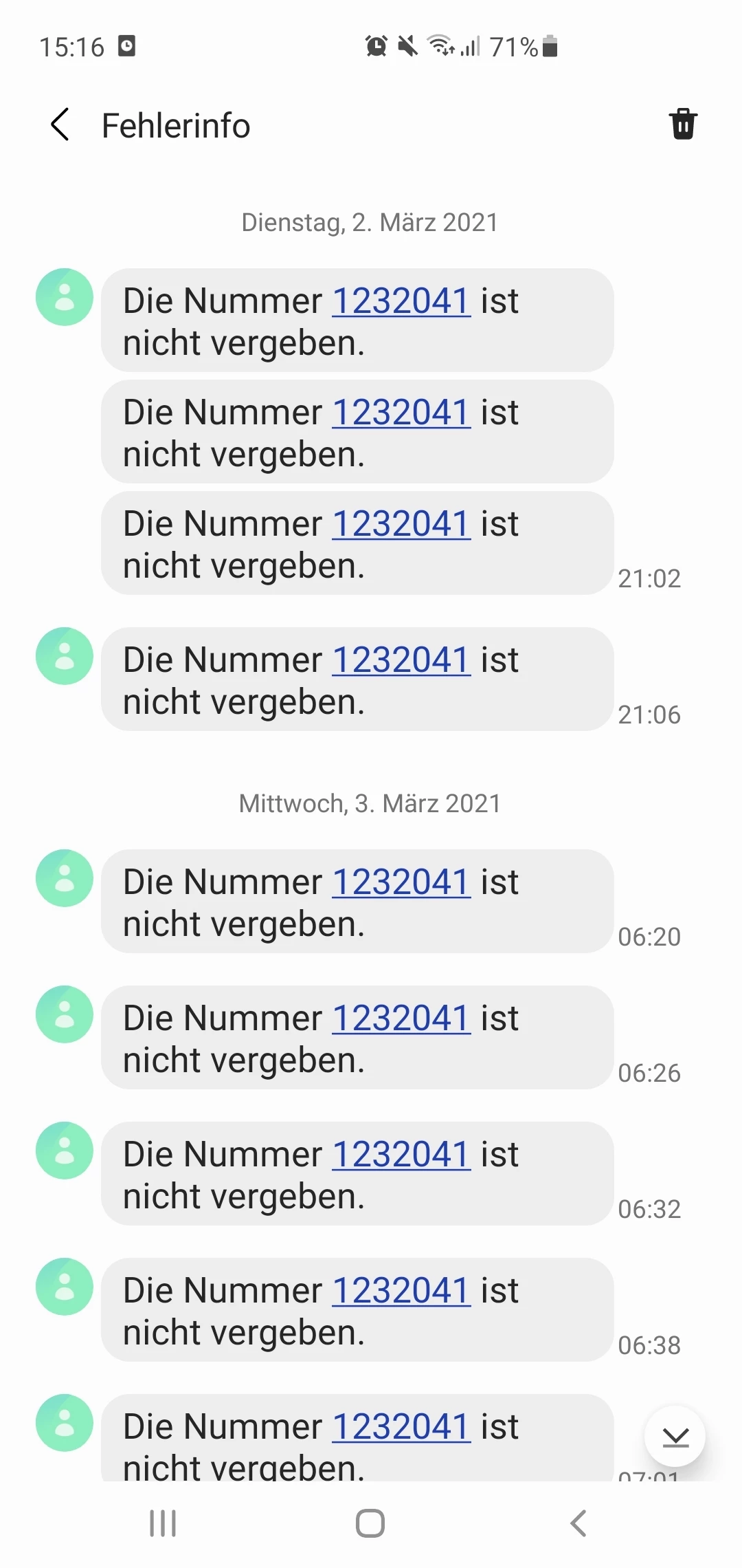 Hallo Kriege seit ein paar tagen immer wieder mehrere, täglich bis zu 100 SMS , “die Nummer 1232041 ist nicht vergeben”.