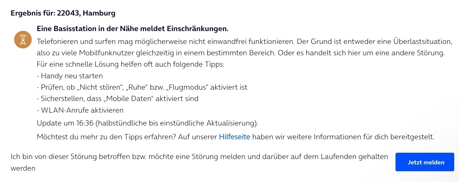 Im “Live Check vor Ort” wechselt meine Adresse zwischen “Eine Basisstation in der Nähe funktioniert im Moment nicht einwandfrei.” und irgendetwas von wegen Wartungsarbeiten.